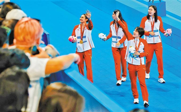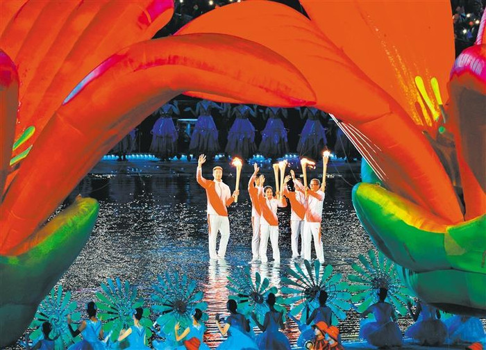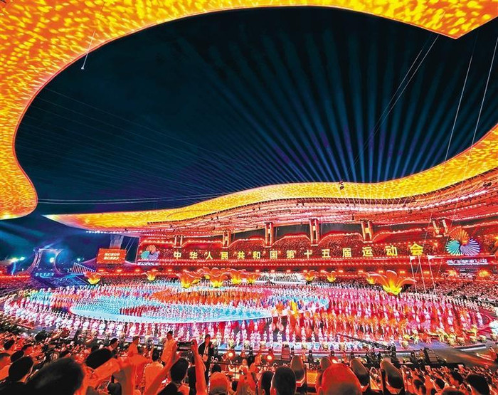 11月9日,志愿者在十五运会开幕式看台与观众互动。本次开幕式场馆及周边赛会志愿者共有2350人,来自广州地区16所高校28个校区。